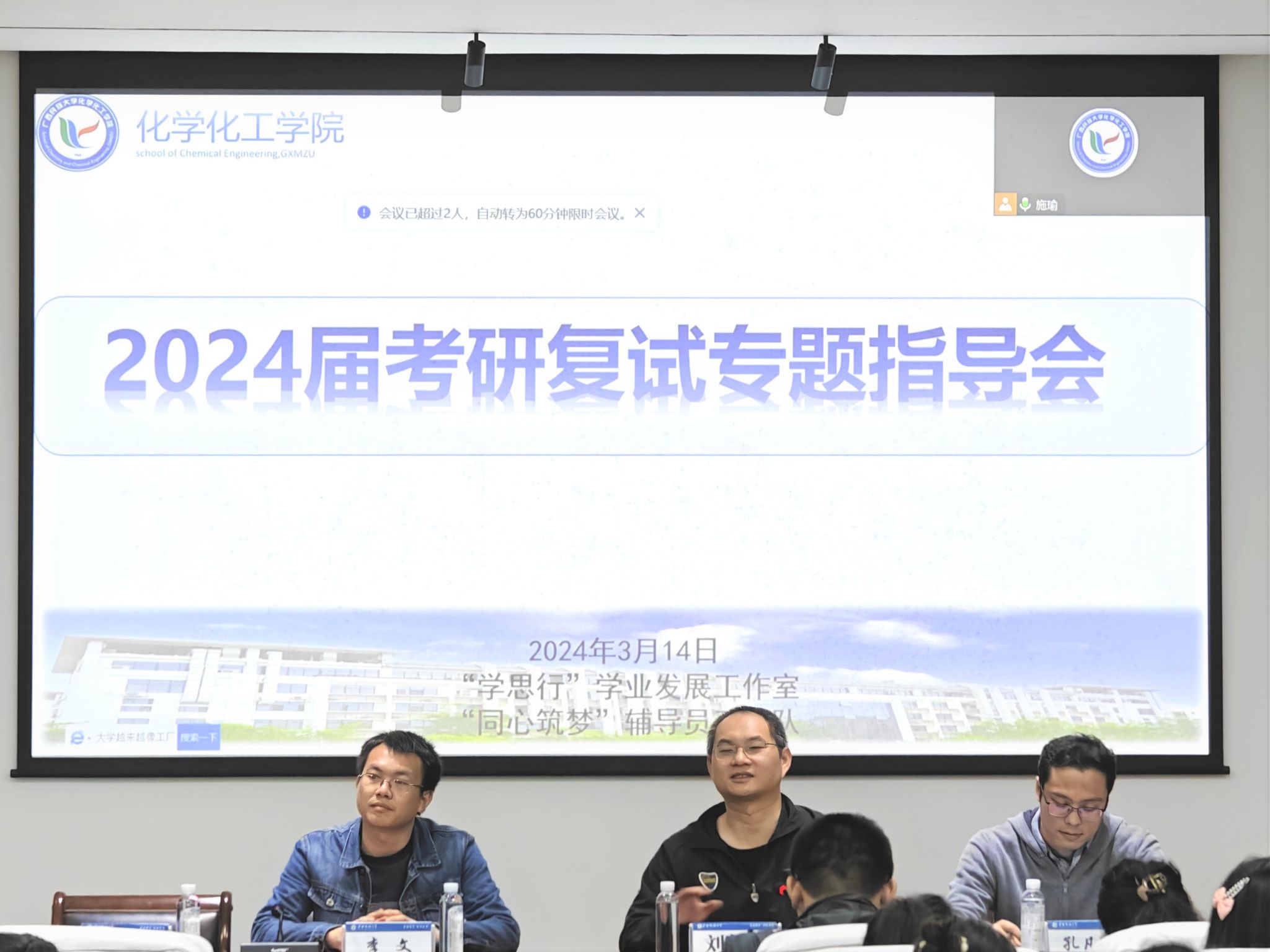 3月14日晚,为提高2024届毕业生考研复试成功率,manbet手机app下载在扬帆楼109会议室召开2024届考研复试专题交流指导会。学院副院长刘绍刚、化学系主任关一富教授、应用化学系主任李文副教授、化学工程与工艺系主任薛兴勇副教授、药学系主任孔凡栋副教授、毕业班辅导员施瑜及部分2024届考研毕业生参加。