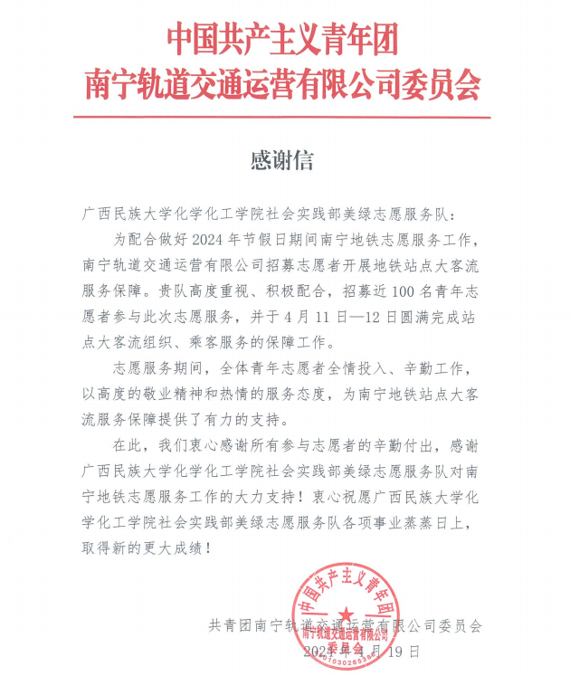 本次志愿服务活动不仅为市民假期出行提供了便利,也为志愿者们的成长搭建了平台。活动结束后,m88在线客服美绿志愿服务队还收到了共青团南宁轨道交通运营有限公司委员会的感谢信。