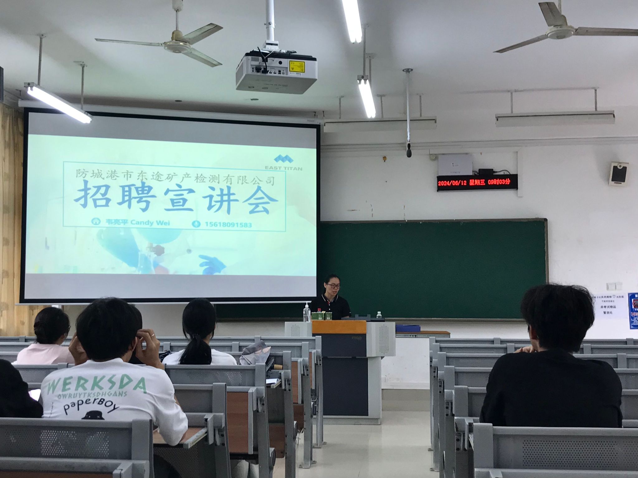 6月12日,m88在线客服在明德楼212教室举办防城港东途矿产检测有限公司实习生宣讲会。防城港东途矿产检测有限公司主任韦亮平做主要宣讲,学院2025届毕业生参加本次会议。