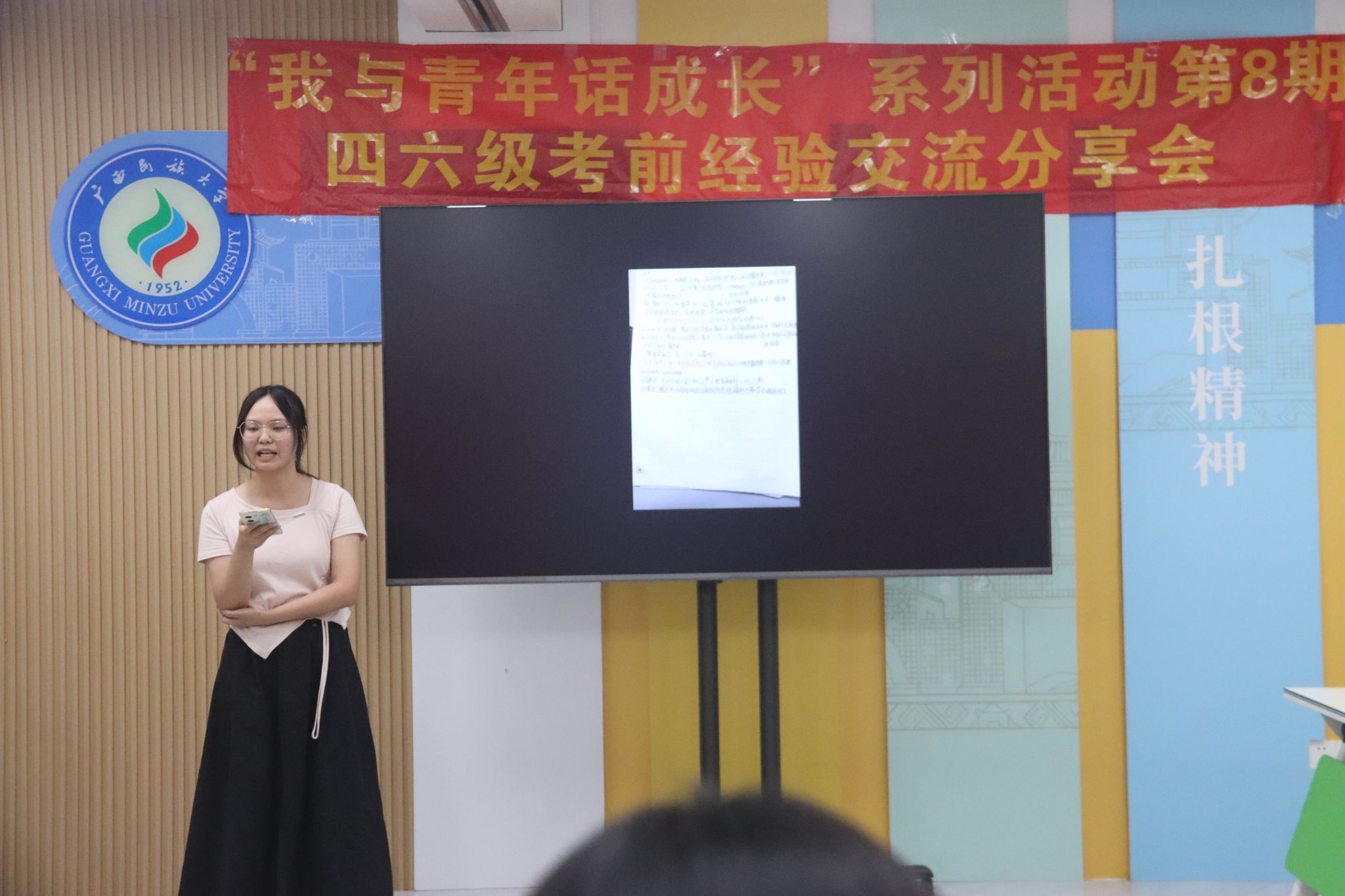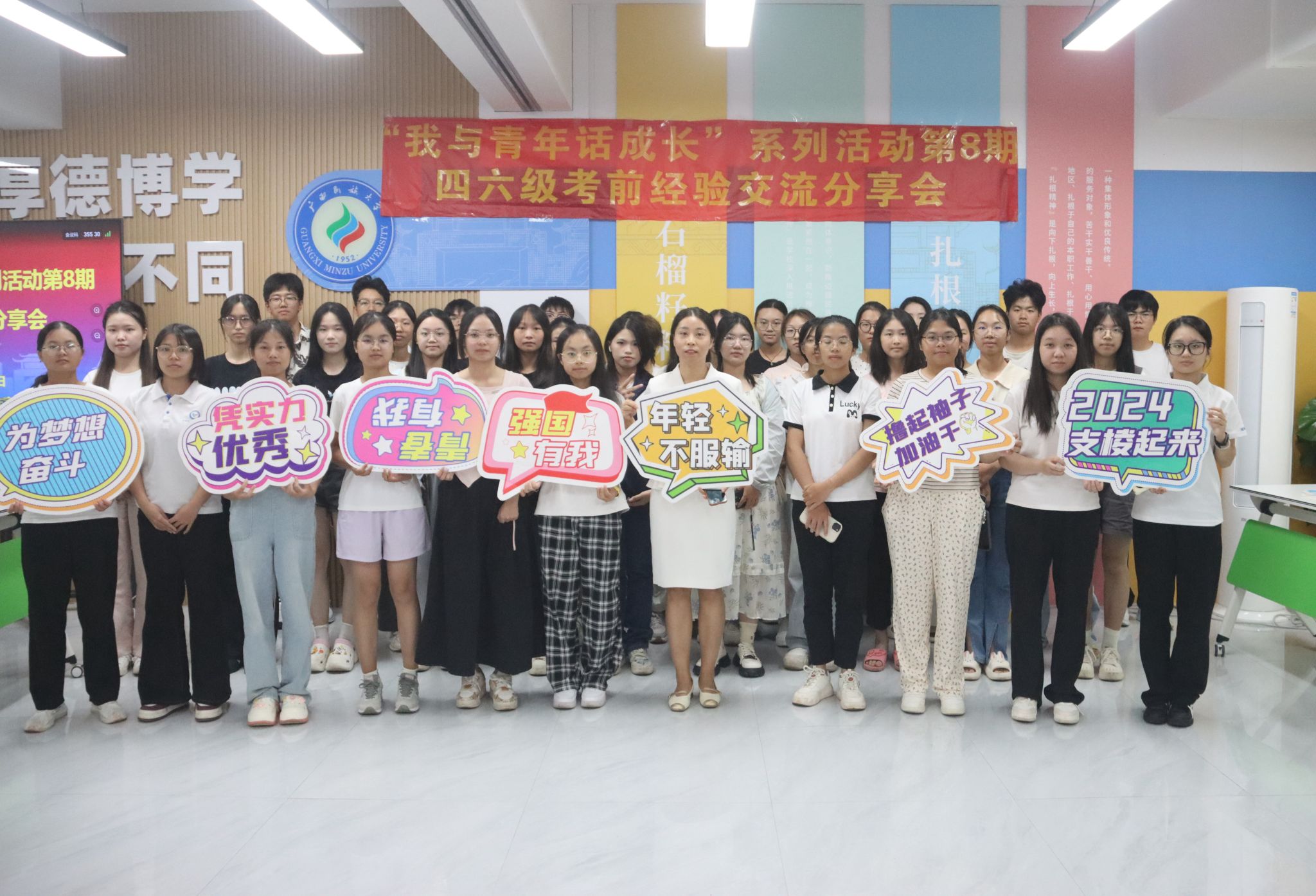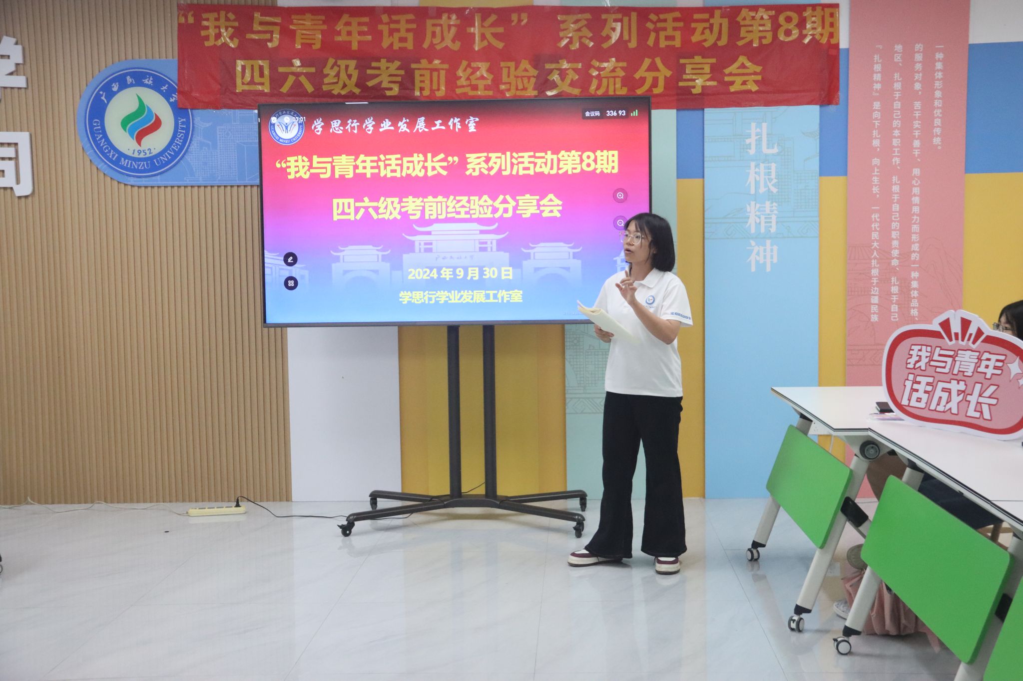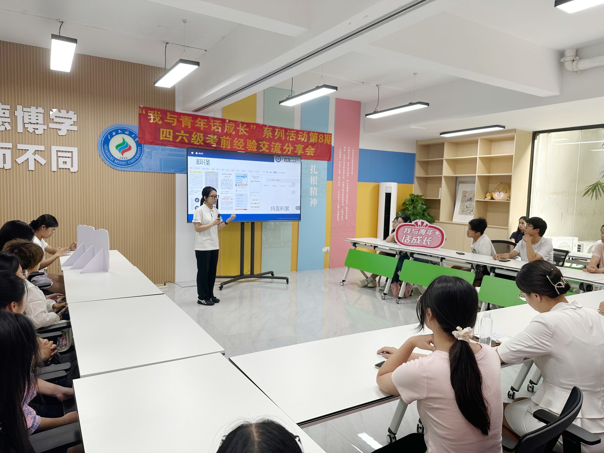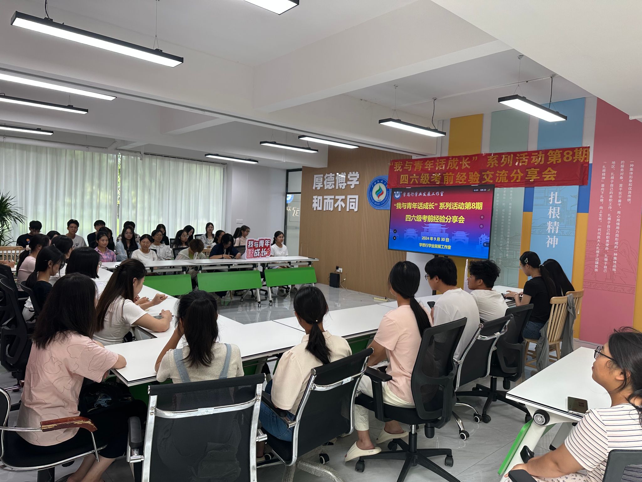 9月30日下午,学思行学业发展工作室在“一站式”学生社区开展“我与青年话成长”第八期活动之四六级考前经验交流分享会。本次活动由学思行学业发展工作室主持人常聪老师组织主持,思源湖校区40余名同学参加。