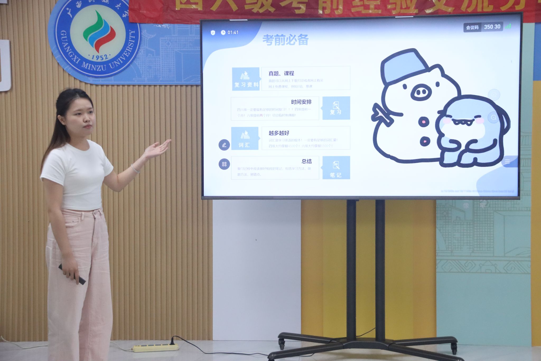 最后,常聪老师对本次活动进行总结,开导同学们要以平常心态应对考试,要提前做好学习规划,希望大家在英语的学习道路上能戒骄戒躁、持之以恒,并预祝同学们在本次四六级考试中取得好成绩。
