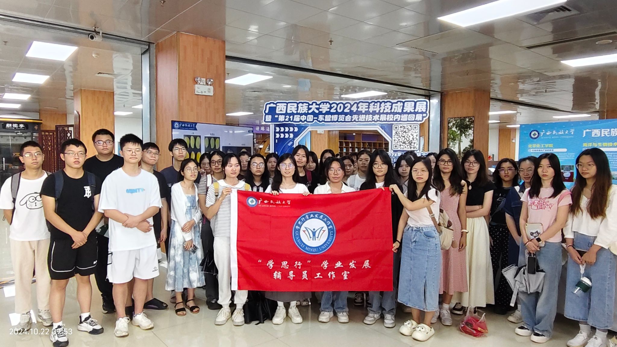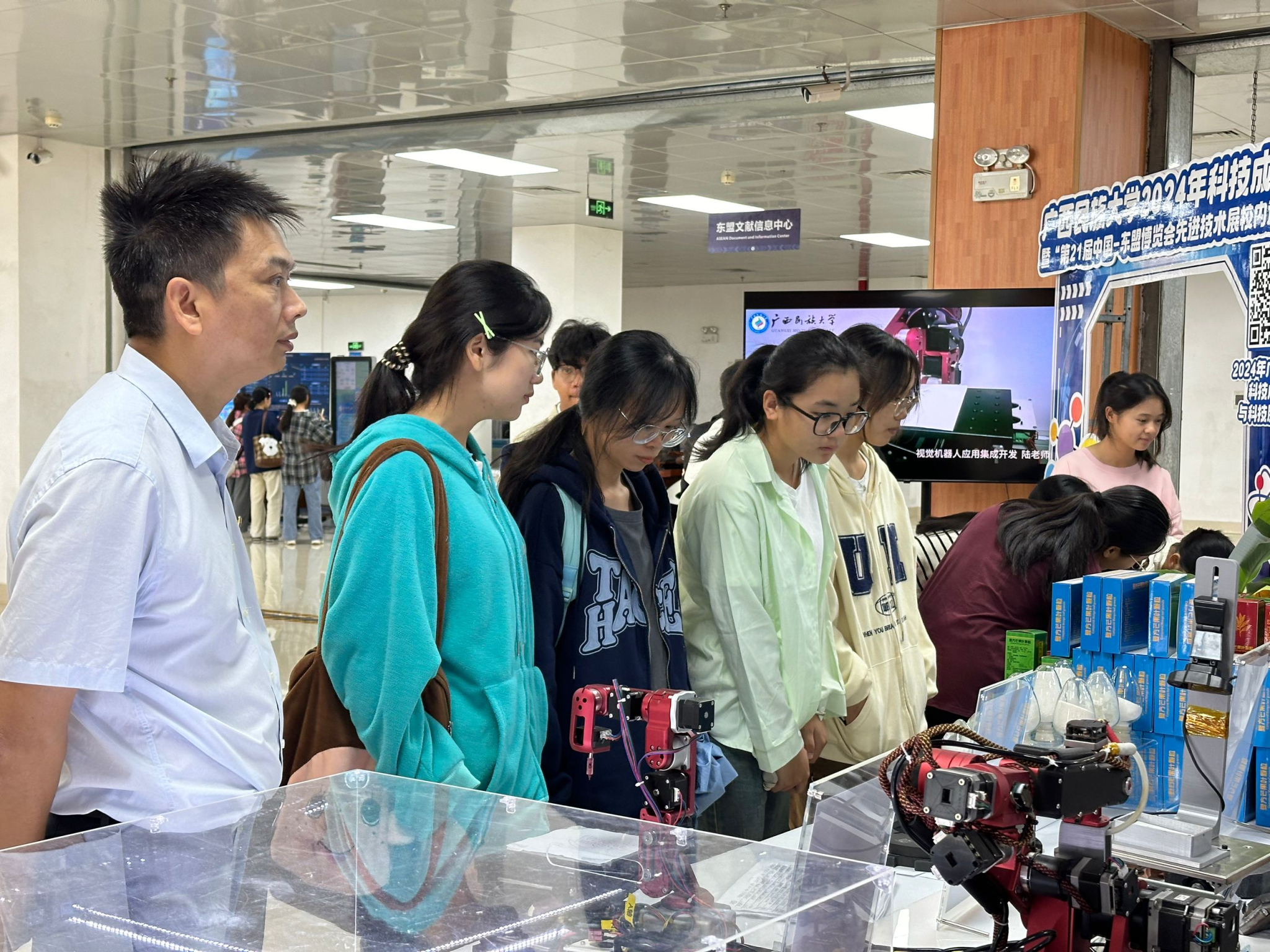 为深入贯彻创新驱动发展战略,进一步激发师生的科技创新激情,manbet手机app下载近日组织师生观摩2024年科技成果展暨“第21届中国-东盟博览会先进技术展校内巡回展”。此次展览于2024年10月21日至10月24日(星期一至星期四)在思源湖校区图书馆二楼大厅举行,其间共有41个班级、党支部及团支部参观学习。