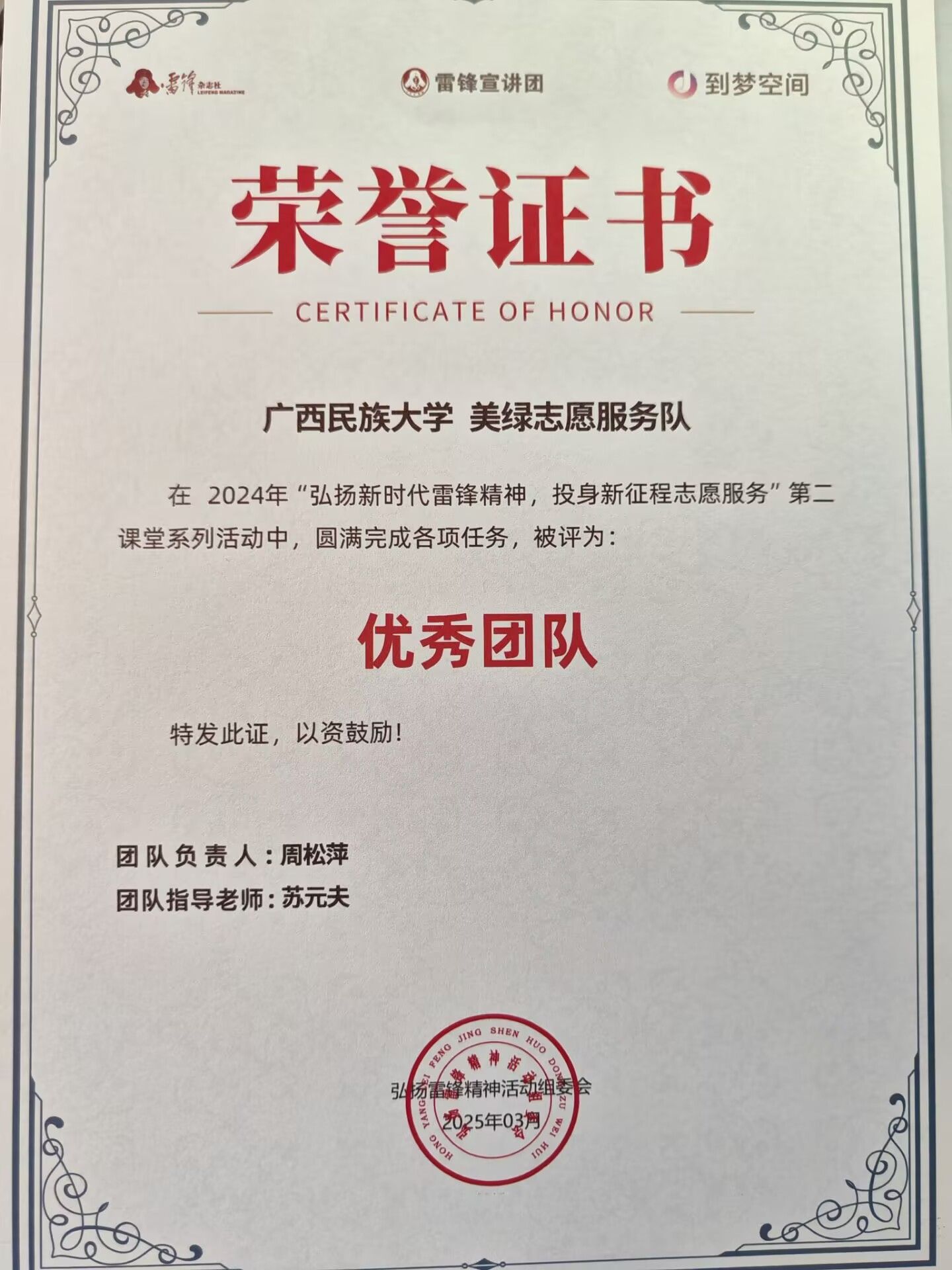 为深入贯彻落实党的二十大精神,认真学习习近平总书记关于《弘扬雷锋精神的重要论述和对深入开展学雷锋活动的重要指示要求》,m88在线客服美绿志愿服务队积极申报并参加了雷锋杂志社和到梦空间联合举办的2024年大学生“弘扬新时代雷锋精神,投身新征程志愿服务”第二课堂系列活动。活动期间,服务队圆满完成各项任务,被评为“优秀团队”。