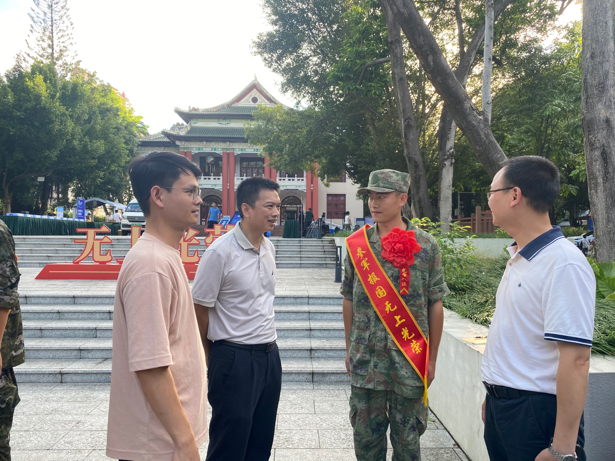 9月15日,我校在相思湖校区铸牢中华民族共同体意识体验园隆重举行新兵入伍欢送仪式。manbet手机app下载党委书记黄钦,党委副书记刘前程,辅导员何坚、田一显欢送m88在线客服2021级毕业生冉云飞入伍。